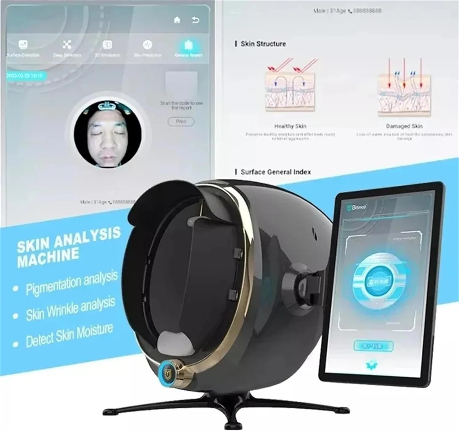 Magic mirror max is the world’s most advanced skin detection equipment together with shooting, analyzing, displaying 3 in 1. It adopts RGB, UV, PL spectral imaging technology, combines with artificial intelligence and image analysis, 30 million clinical databases, achieving 15 seconds efficient skin analysis. Such as: spot, pore, moisture, texture, wrinkle and so on total 12 dermis and epidermis skin problems. According to the test results, Magic Mirror Max recommends products for customized skin management program and predicting the trend of future skin 3-5 years. It is an essential skin detection equipment for cosmetic company, beauty salon, skin clinic and training school, the market demand rate can be as high as 100%.