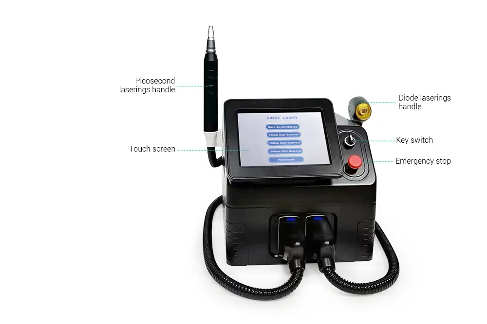 The 3-Wavelengths Diode + Picosecond Laser 2-in-1 Hair & Tattoo Removal Machine is a professional-grade dual-laser system engineered to provide high-performance hair removal and tattoo/pigmentation treatment in a single device.