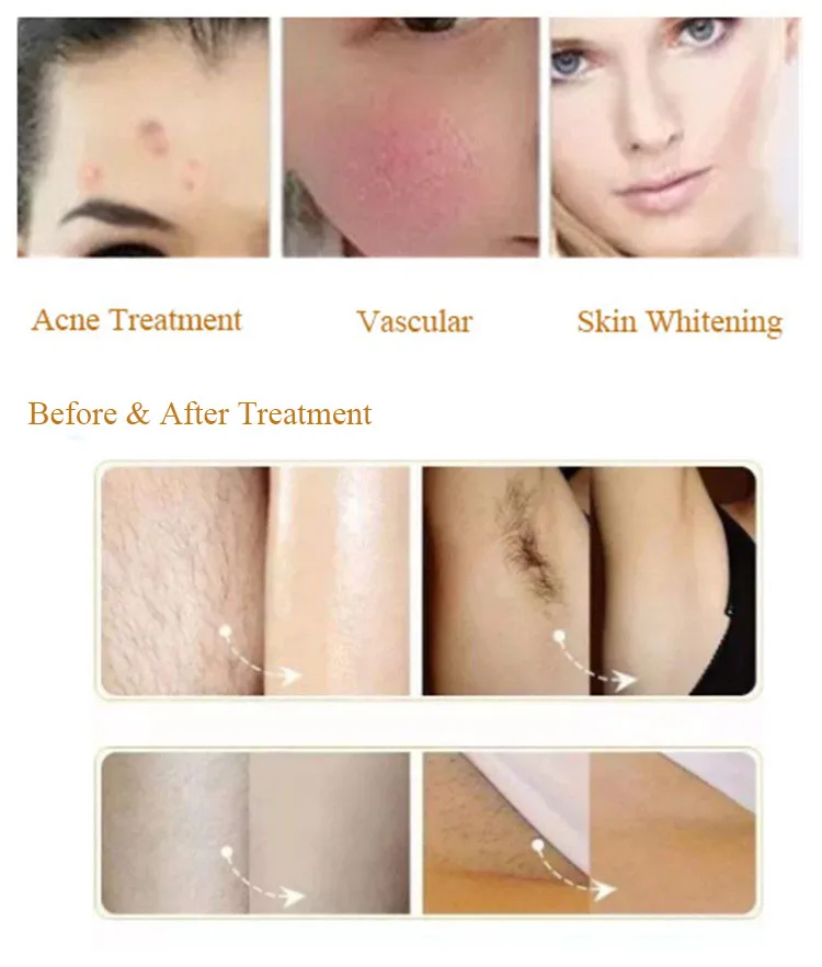 The theory is the energy from IPL acting on the 15mm depth of surface, plus RF to prevent hair growth without hurting the sweat glands. Naturally, the hair will be never grown for the hair follicles closed, and having no melanin. Generally, there are 3 cycle of hair growth: Growth Phase, Maturity Phase, Dormancy Phase, and the treatment will be most effectively in hair’s Growth Phase, so patients need do the treatment 3-4 times to achieve permanent hair removal.